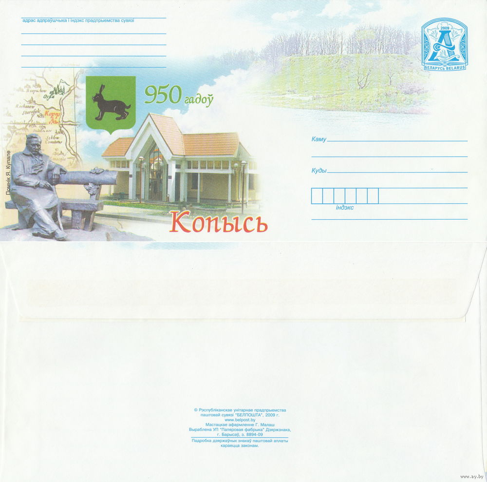 Беларусь 2009 950 лет. Копысь. Памятник Я. Купале герб города, памятник, дом культуры (к4)