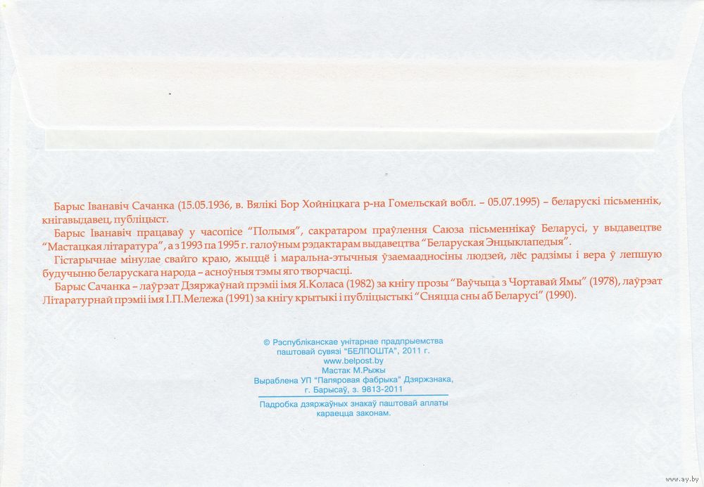 Беларусь 2011 Борис Саченко 1936-1995 75 лет со дня рождения (к4)