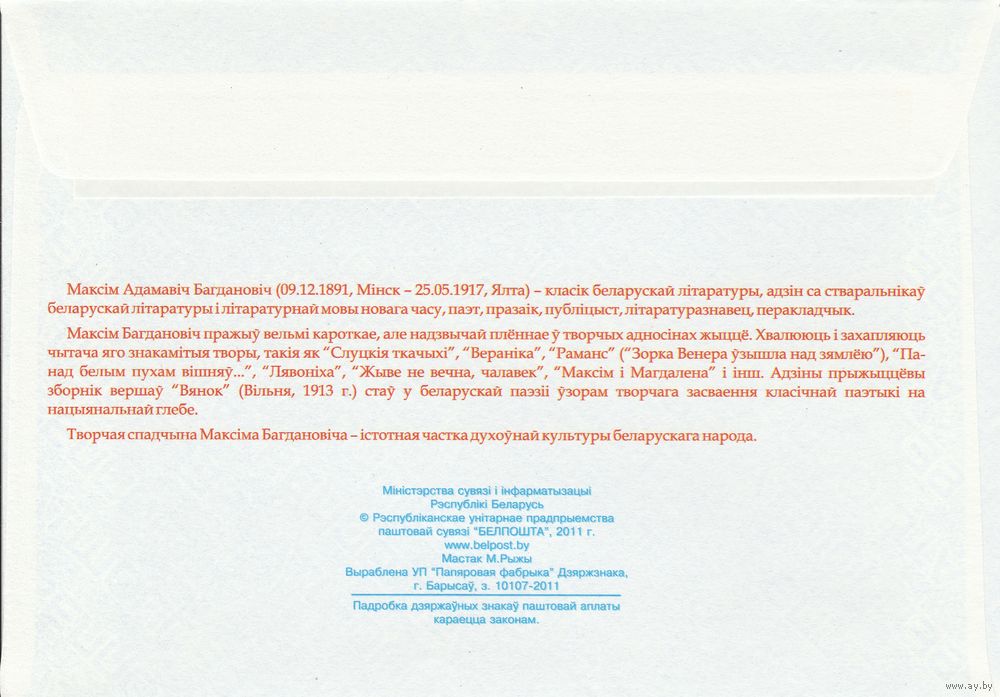 Беларусь 2011 ХМК с ОМ 120 лет со дня рождения Максима Богдановича (к5)