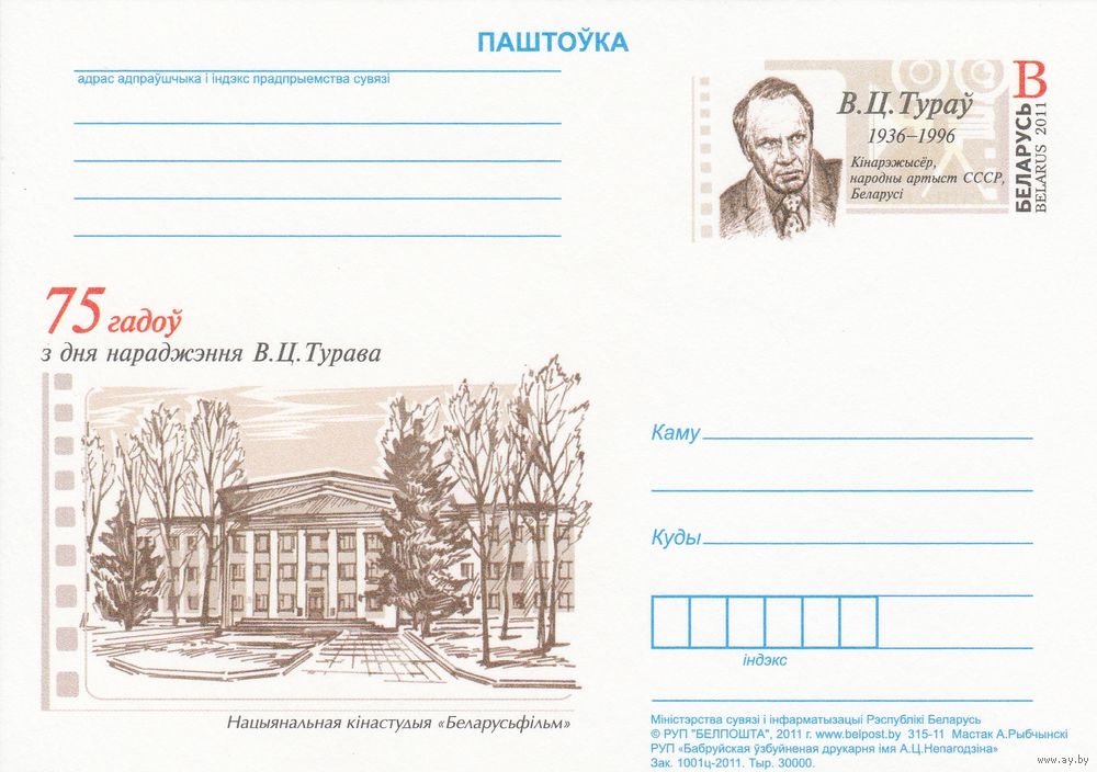 Беларусь 2011 ПК с ОМ 75 лет со дня рождения В. Т. Турова (алб)
