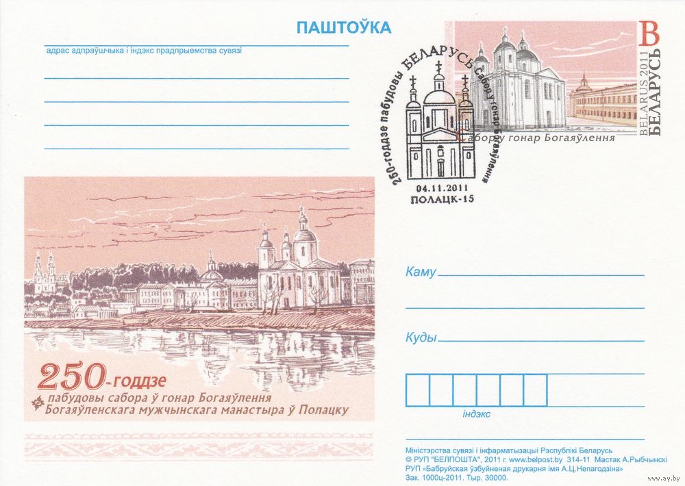 Беларусь 2011 ПК с ОМ со СГ 250-летие постройки собора в честь Богоявления Богоявленского мужского монастыря в Полоцке (алб)