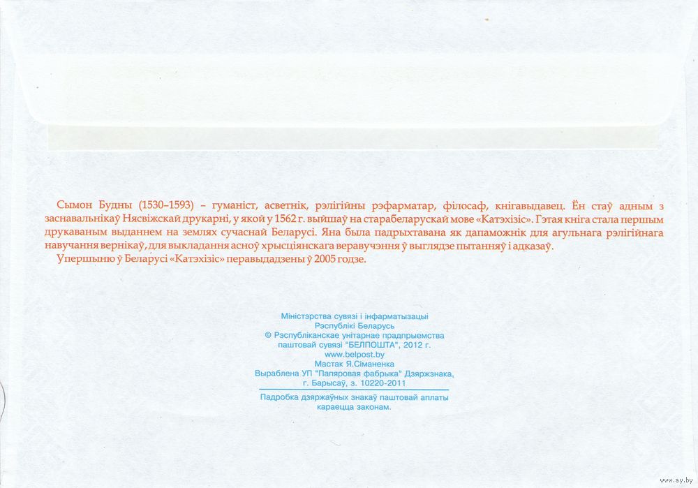 Беларусь 2012 ХМК с ОМ 450-летие издания С.Будным в Несвижской типографии Катехизиса (к5)