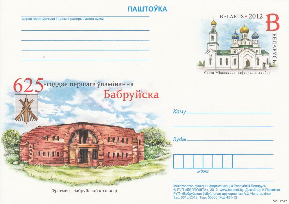 Беларусь 2012 ПК с ОМ 625-летие первого упоминания Бобруйска (алб)