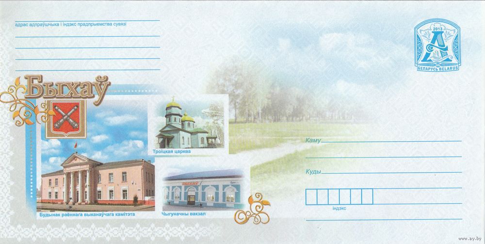 Беларусь 2013 Быхов. Здание раенного исполнительного комитета. Троицкая церковь. Железнодорожный вокзал (с бумагой) (к4)