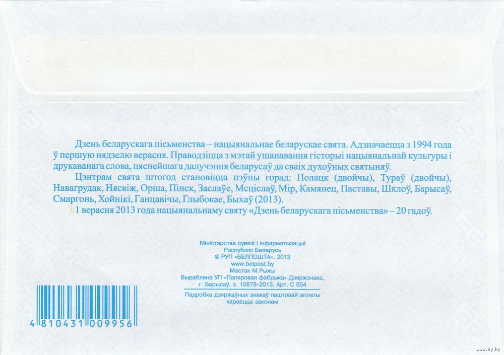 Беларусь 2013 ХМК с ОМ День белорусской письменности в Быхове (к5)