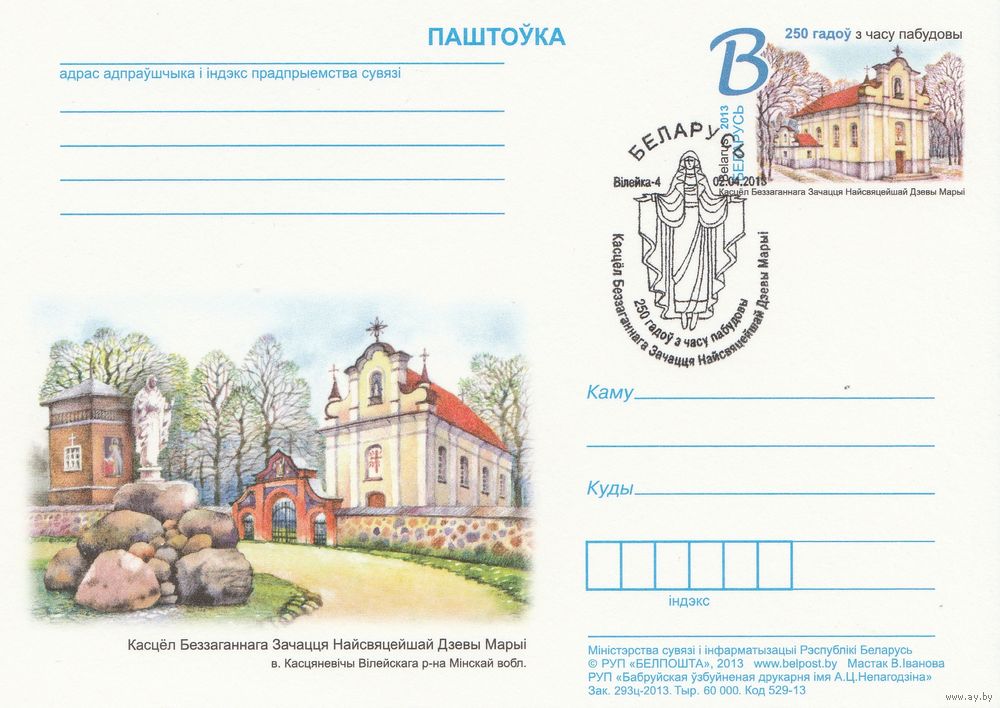 Беларусь 2013 ПК с ОМ со СГ 250 лет со времени постройки костела Непорочного Зачатия Пресвятой Девы Марии в д. Костеневичи Вилейского р-на Минской обл. (к5)