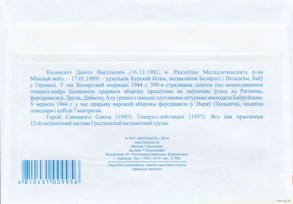 Беларусь 2015 Герой Советского Союза Казакевич Данил Васильевич (к4)