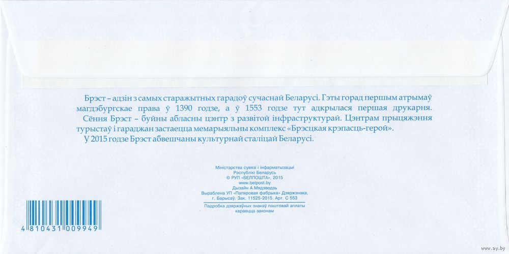 Беларусь 2015 ХМК с ОМ Брест - культурная столица Беларуси 2015 г. (к4)