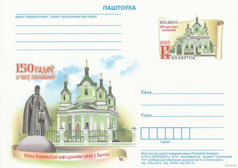 Беларусь 2015 ПК с ОМ 150 лет со времени основания Свято-Симеоновского кафедрального собора в Бресте (к5)