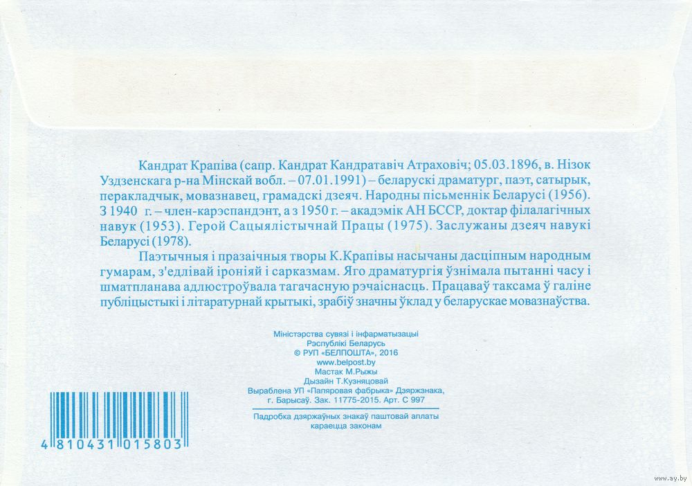 Беларусь 2016 ХМК с ОМ 120 лет со дня рождения Кондрата Крапивы (к5)
