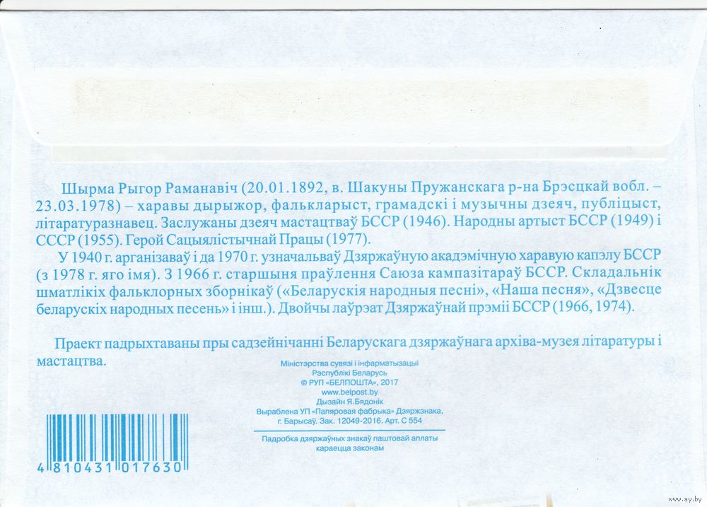 Беларусь 2017 ХМК с ОМ 125 лет со дня рождения Григория Ширмы (к5)