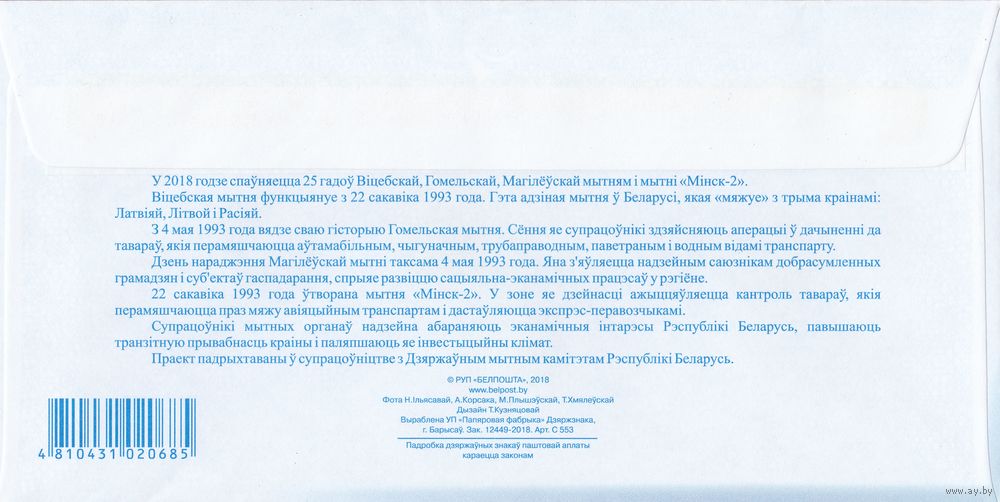 Беларусь 2018 25-летие Витебской, Гомельской, Могилевской таможен, таможни Минск-2 (к4)