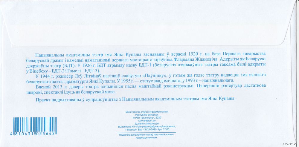 Беларусь 2020 ХМК с ОМ 100 лет Национальному академическому театру имени Янки Купалы (к4)