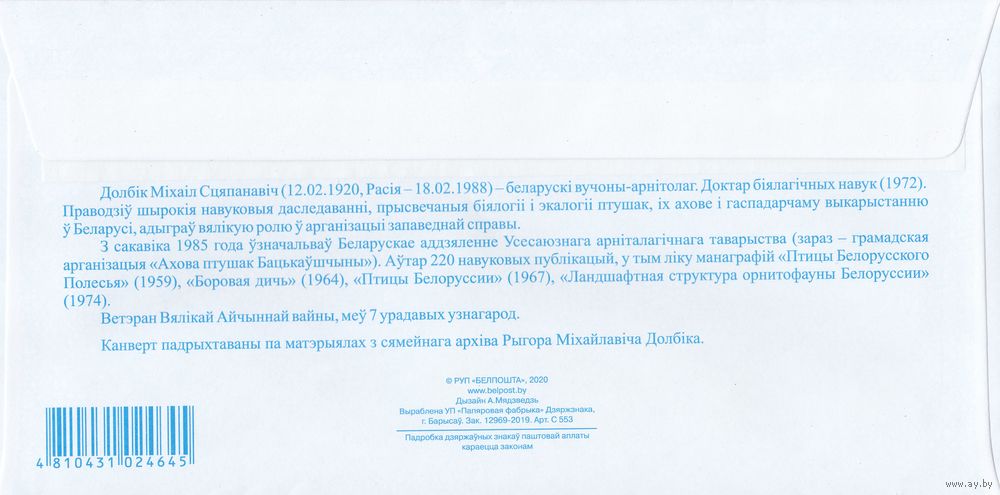 Беларусь 2020 Известные личности Беларуси 100 лет со дня рождения Долбика Михаила Степановича (к4)