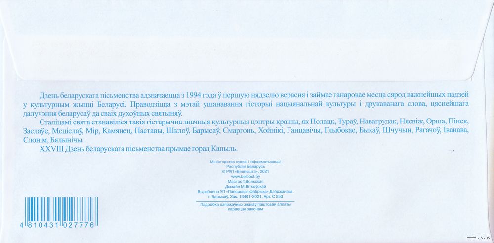 Беларусь 2021 ХМК с ОМ День белорусской письменности в Копыле (к4)