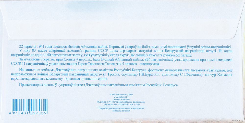 Беларусь 2021 Подвиг пограничников в начале Великой Отечественной войне памятник героям-погранчникам в Брестской крепости (к4)