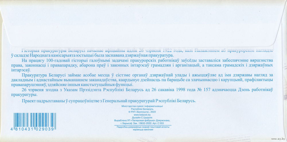 Беларусь 2022 ХМК с ОМ 100 лет белорусской прокуратуре (к4)