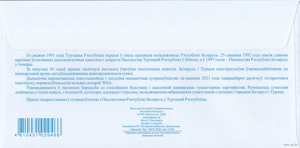Беларусь 2022 ХМК с ОМ 30-летие установления дипломатических отношений между Республикой Беларусь и Турецкой Республикой (к4)
