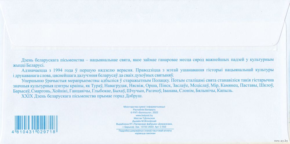 Беларусь 2022 ХМК с ОМ День белорусской письменности. Добруш (к4)
