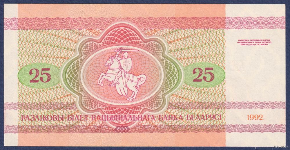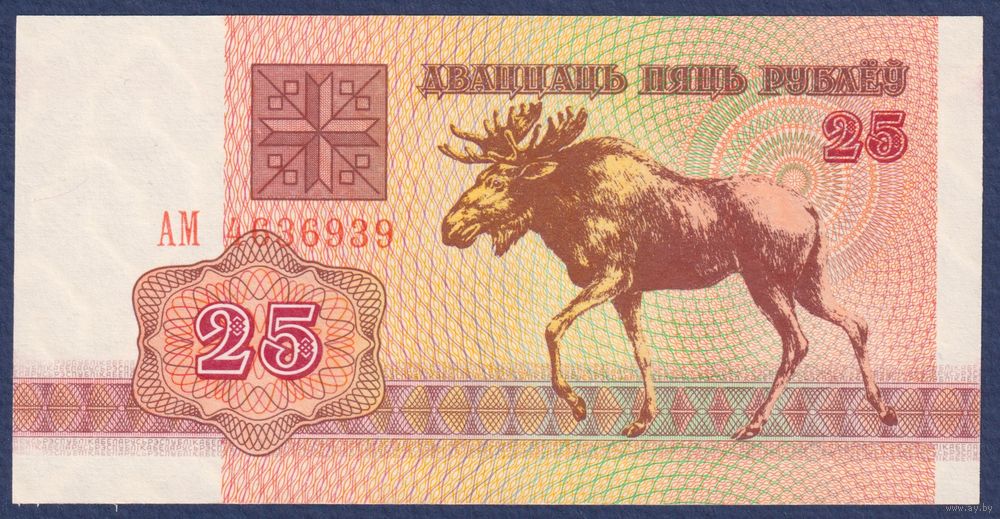 Беларусь, 25 рублей 1992 г, P-6 (серия АМ, лось, водяной знак в1), UNC