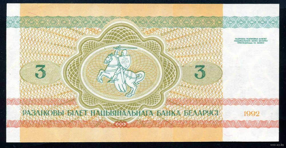Беларусь. 3 рубля образца 1992 года. Серия АУ. UNC