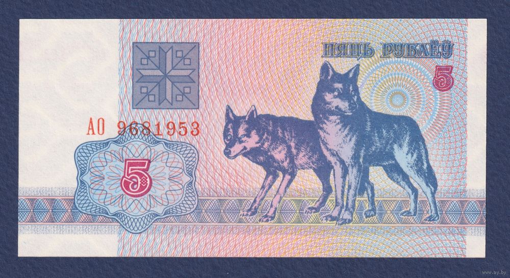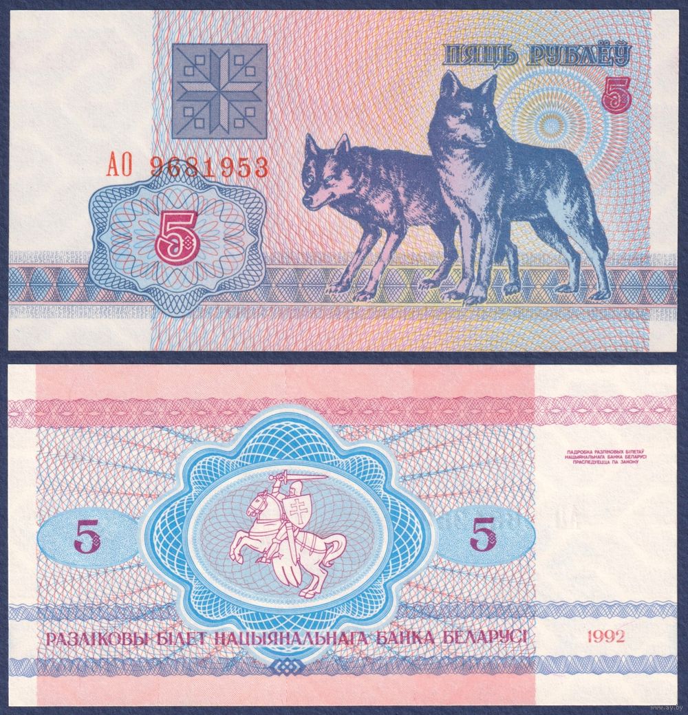 Беларусь, 5 рублей 1992 г, P-4 (серия АО, волк, водяной г1), UNC