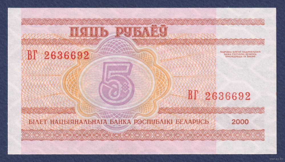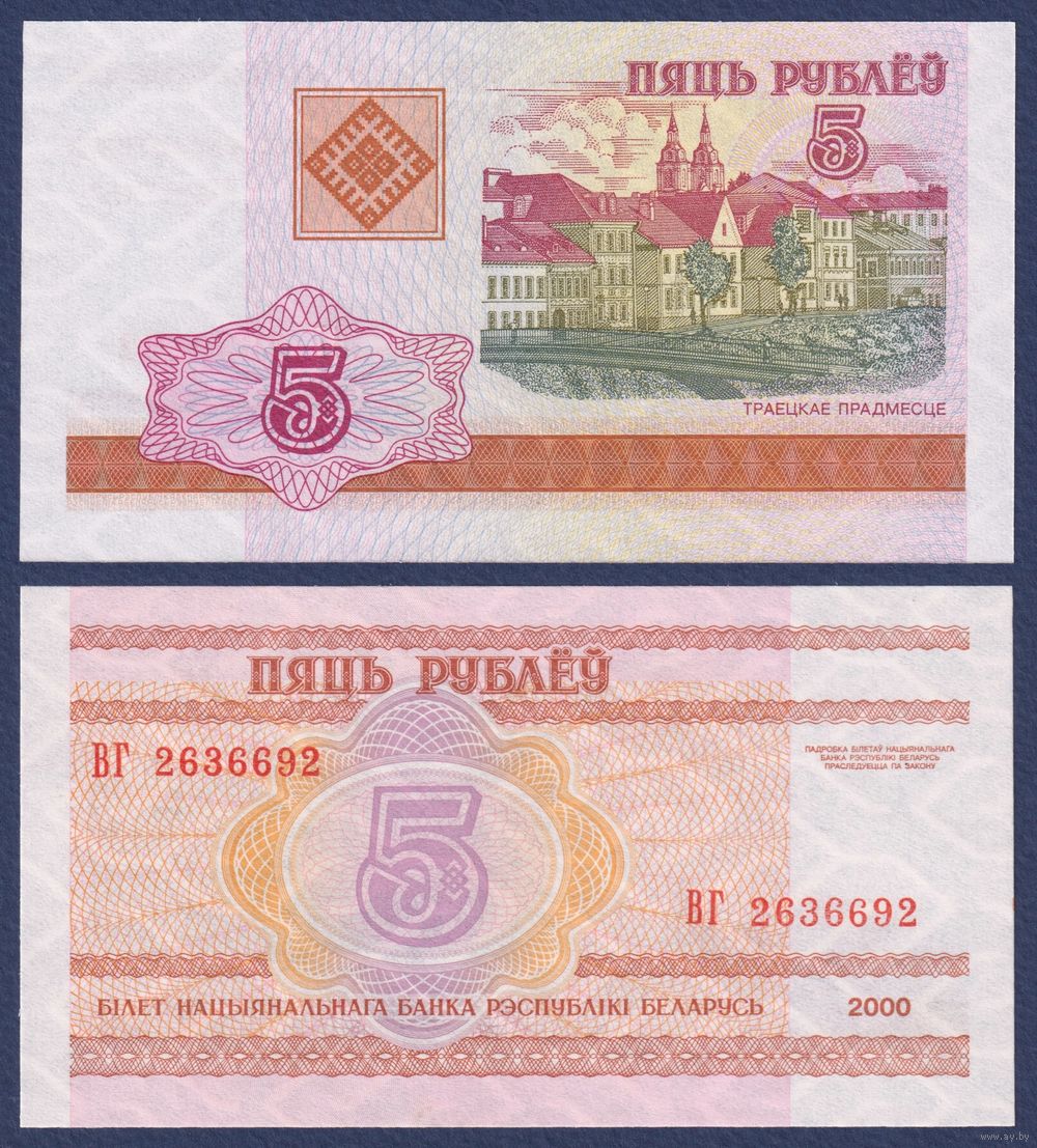 Беларусь, 5 рублей 2000 (2000) г., P-22 (серия ВГ), UNC