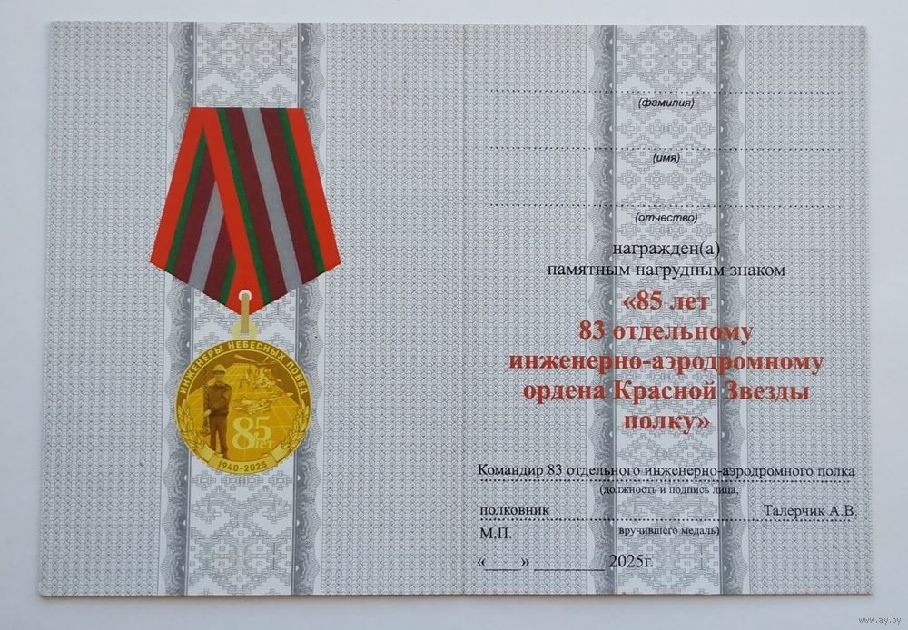 Беларусь. 85 лет 83 отдельному инженерно-аэродромному ордена Красной Звезды полку. С удостоверением. Оплата на карту Беларусбанка.