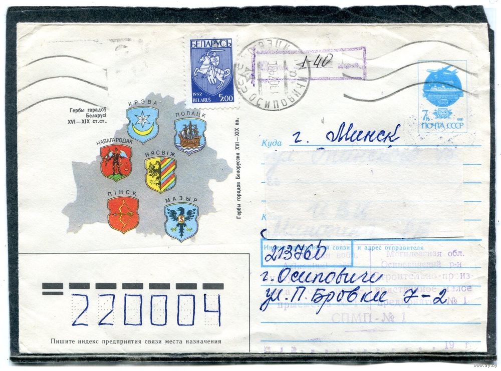 Беларусь. ХМК. Конверт п.п. Провизорий. Гербы городов. Гашение Осиповичи 1993