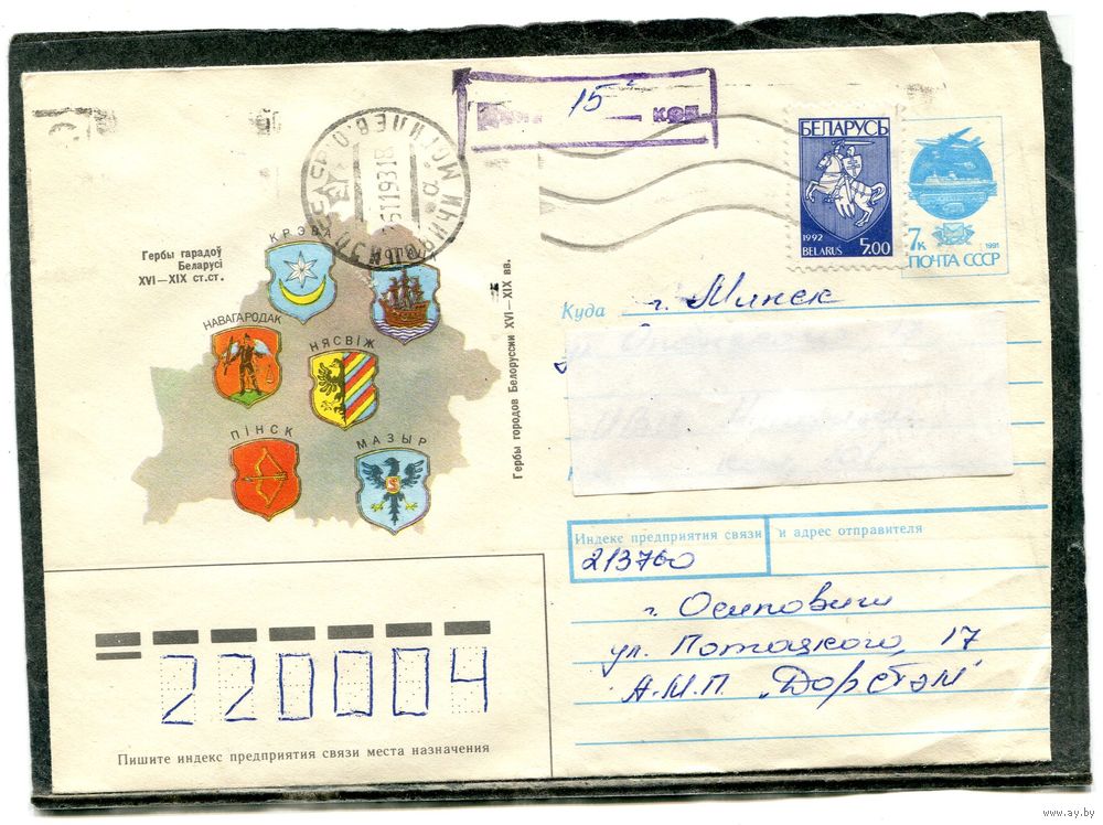 Беларусь. ХМК. Конверт п.п. Провизорий. Гербы городов. Гашение Осиповичи 1993