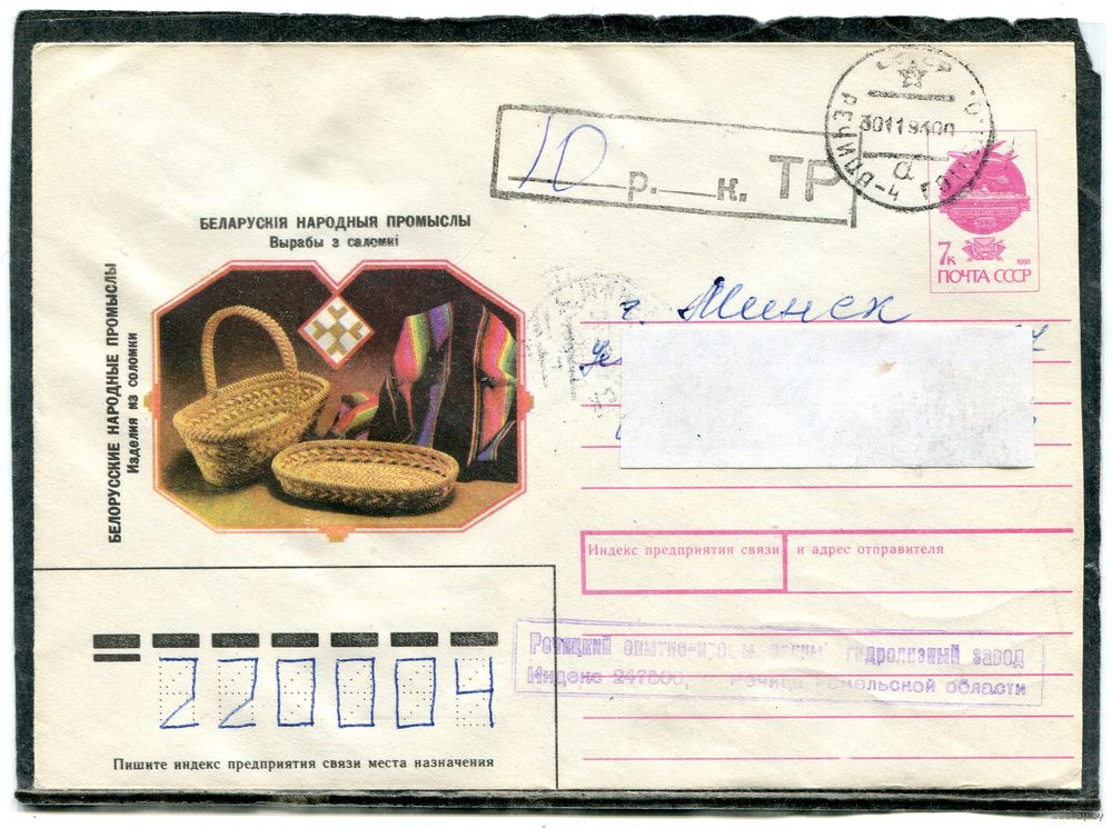 Беларусь. ХМК. Конверт п.п. Провизорий. Народные промыслы. Гашение Речица, Гомельской области 1993