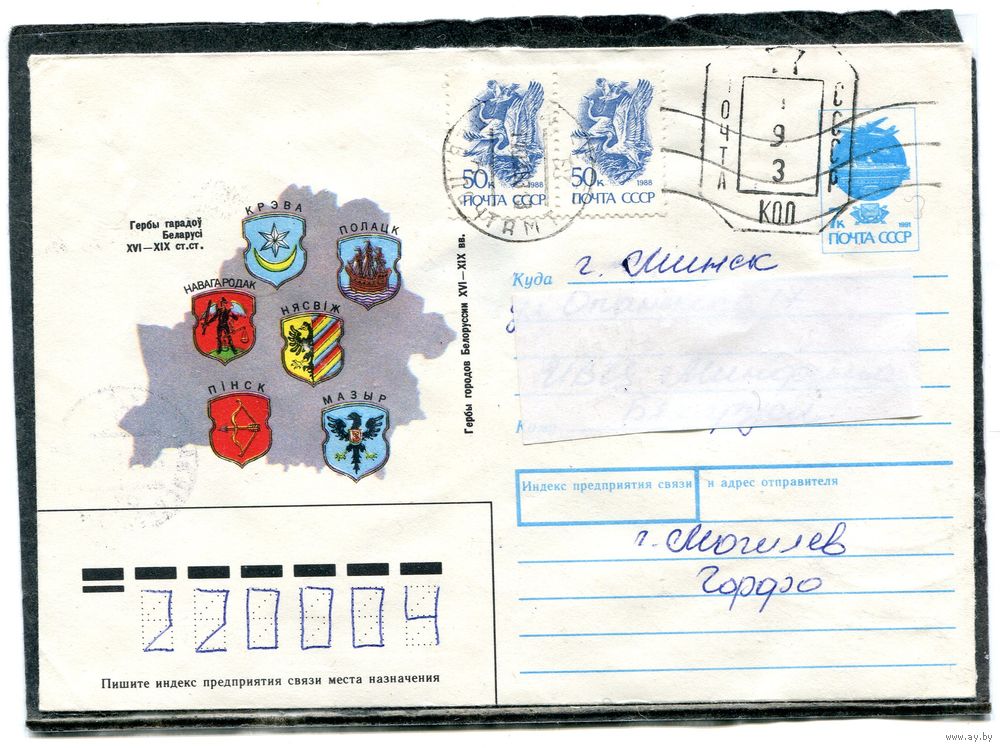 Беларусь. ХМК. Конверт п.п. Штемпель переоценки. Гербы городов. Гашение Могилев 1993