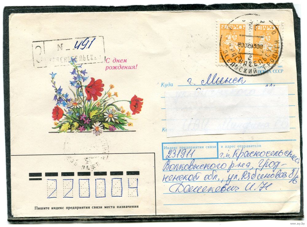 Беларусь. ХМК. Конверт п.п. Заказное. Провизорий. Гашение Красносельск 1993