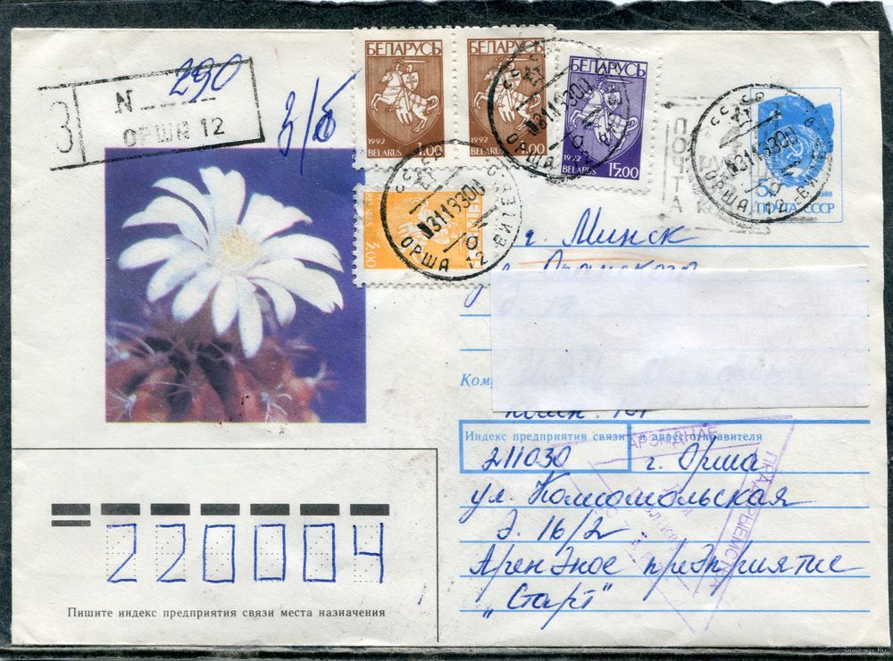 Беларусь. ХМК. Конверт п.п. Заказное. Провизорий. Кактус. Гашение Орша 1993