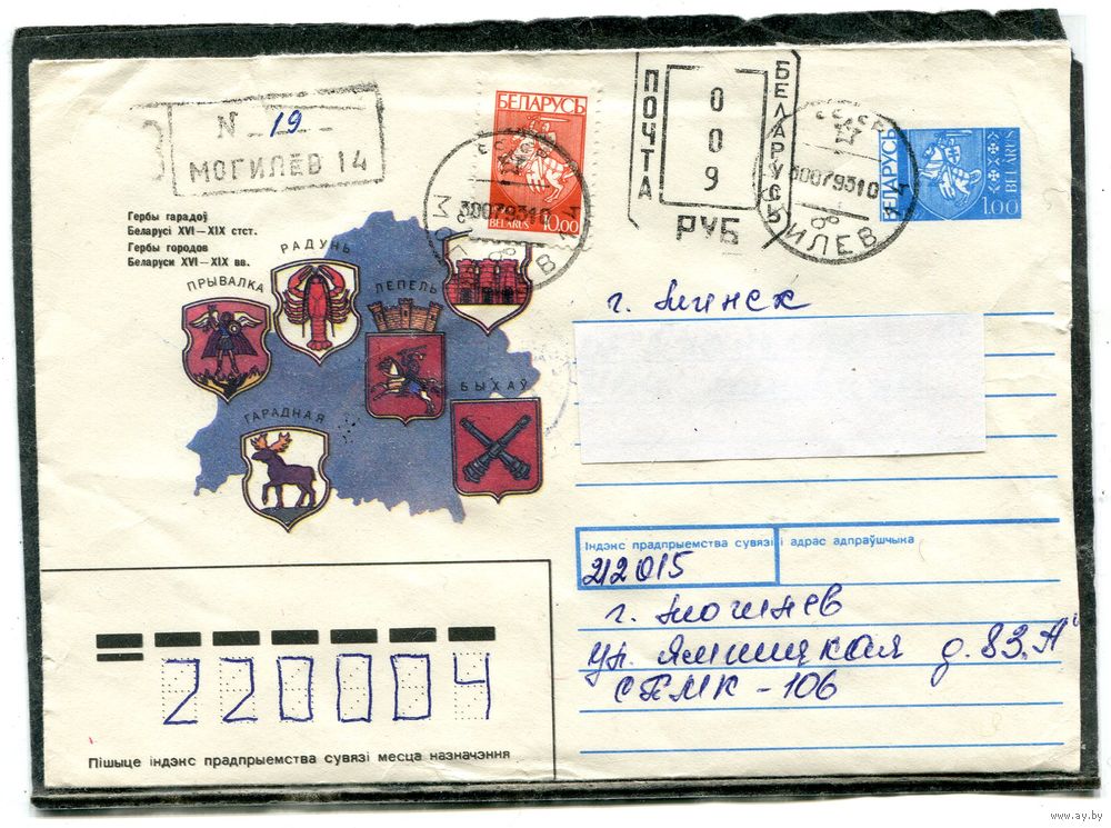 Беларусь. ХМК. Конверт п.п. Заказное. Штемпель переоценки. Провизорий. Гербы городов. Гашение Могилев 1993