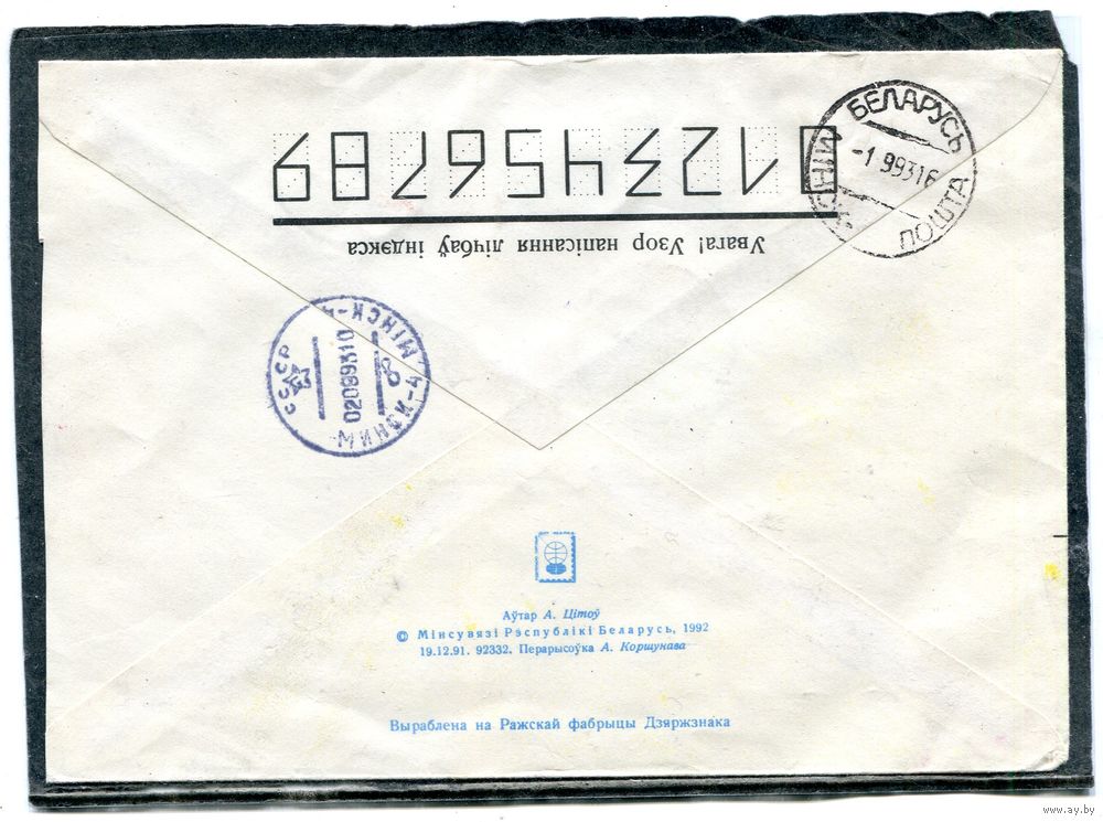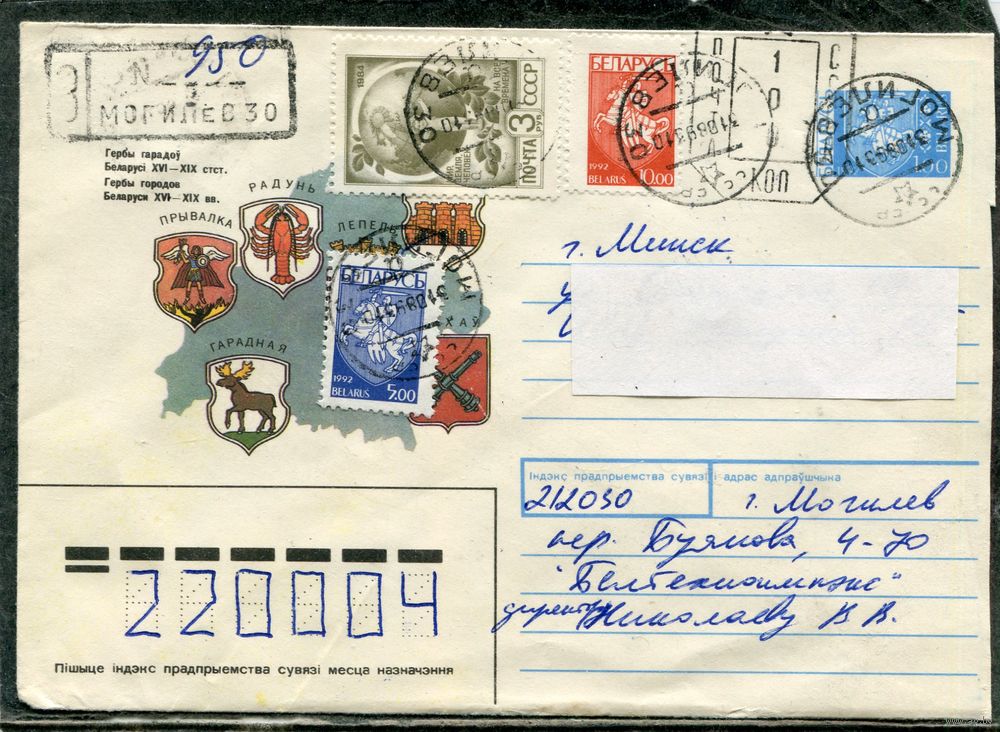 Беларусь. ХМК. Конверт п.п. Заказное. Смешанная маркировка. Штемпель переоценки. Провизорий. Гашение Могилев 1993