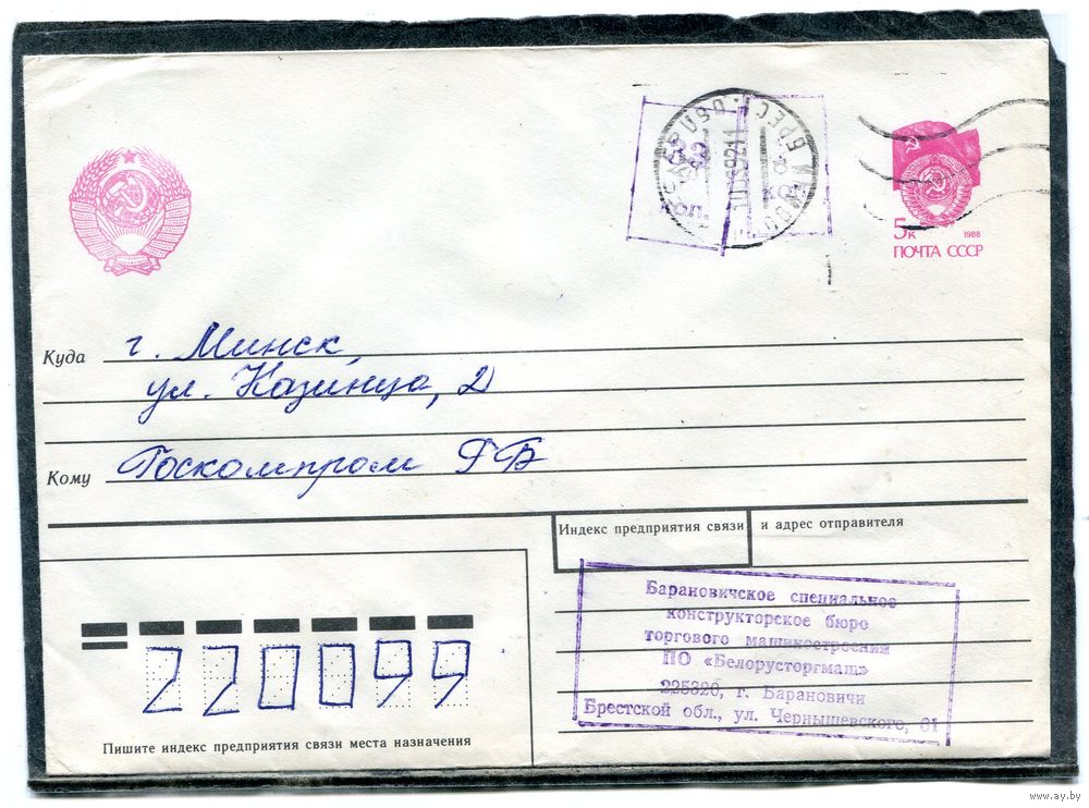 Беларусь. МК. Конверт п.п. Провизорий. Гашение Барановичи 1992