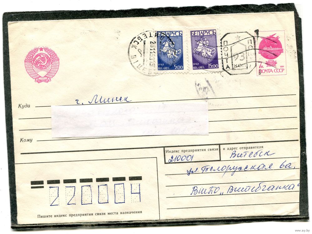 Беларусь. МК. Конверт п.п. Провизорий. Гашение Витебск 1993