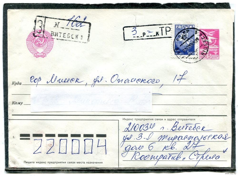 Беларусь. МК. Конверт п.п. Заказное. Провизорий. Гашение Витебск 1993