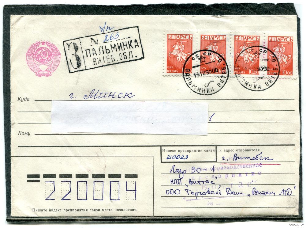 Беларусь. НМК. Конверт п.п. Заказное. Провизорий. Гашение Пальминка Витебской области 1993
