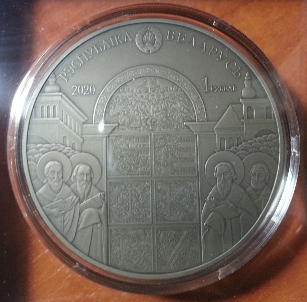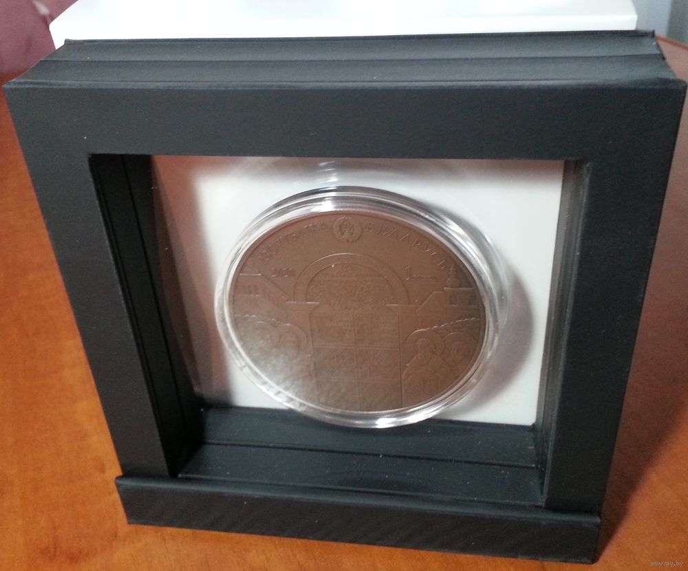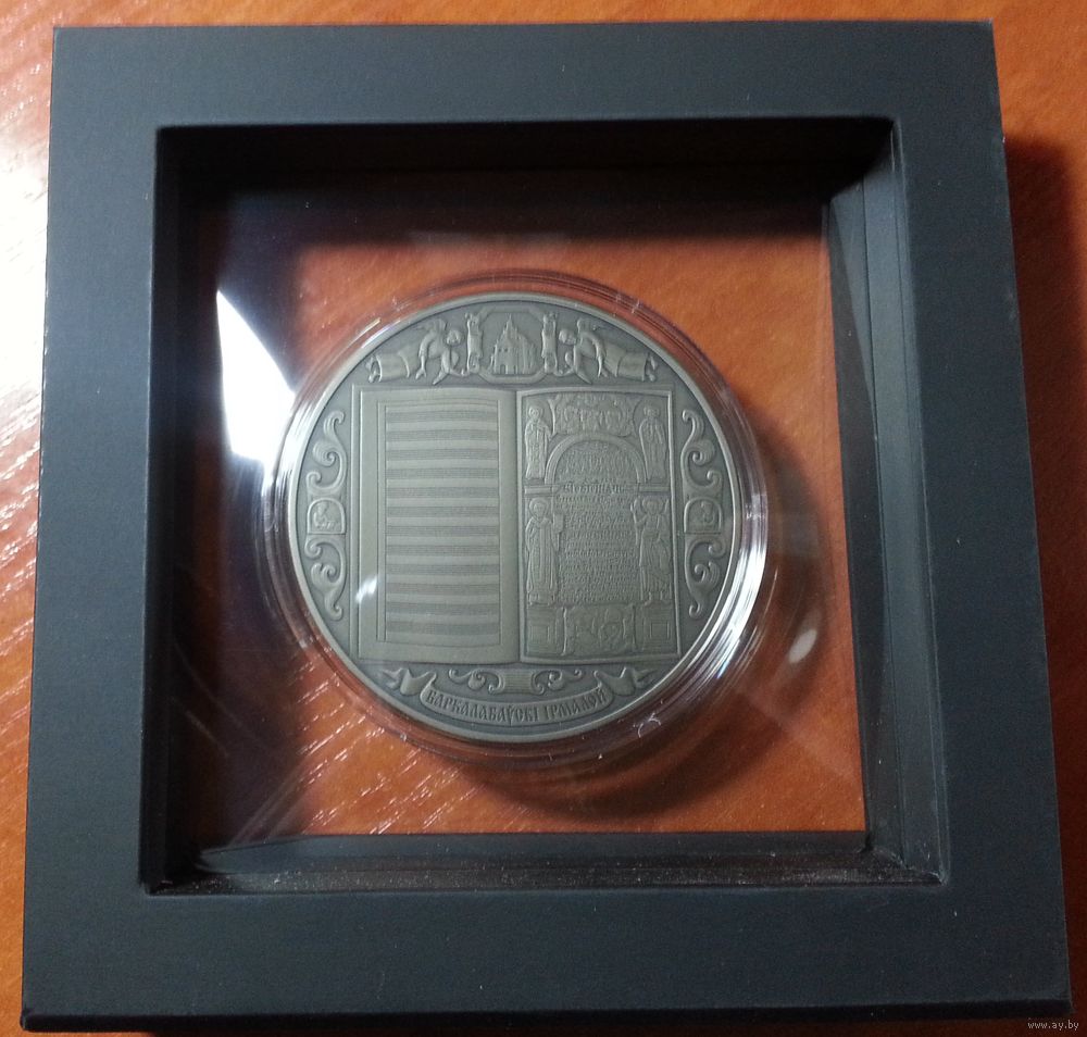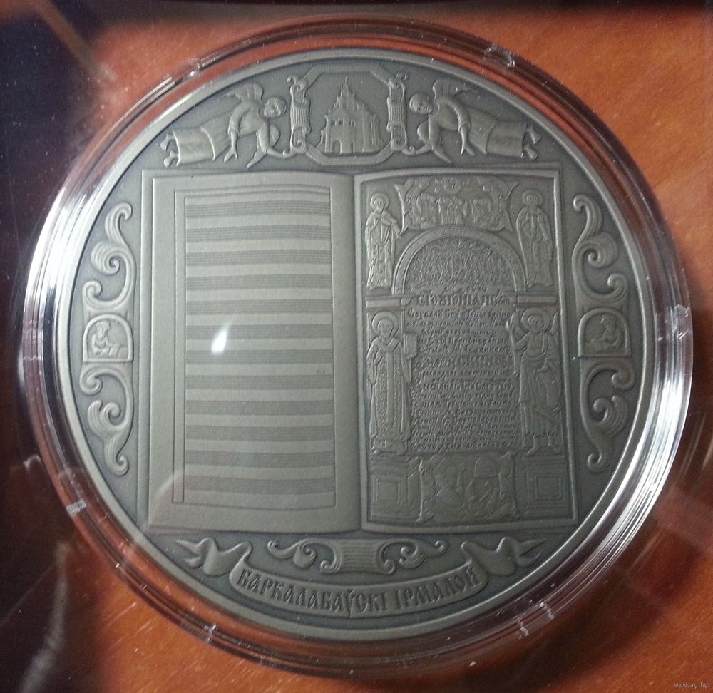 в центре – разворот Барколабовского ирмологиона с изображением титульного листа. По окружности монеты – орнаментальные элементы по мотивам титульного листа ирмологиона. Внизу – надпись: БАРКАЛАБАЎСКІ ІРМАЛОЙ. Вверху – два ангела, держащие медальон с изображением Свято-Троицкого храма Кутеинского монастыря.