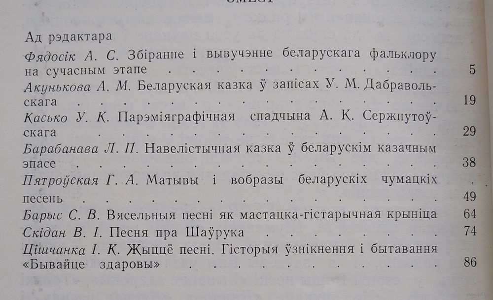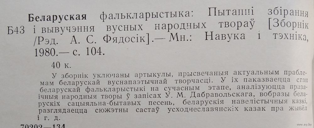 Беларуская фалькларыстыка: пытанні збірання і вывучэння вусных народных твораў. Зборнік артыкулаў. Акадэмія навук Беларускай ССР, Інстытут мастацтвазнаўства, этнаграфіі і фальклору. - Мінск : Навука і тэхніка, 1980 г. 102 с. Мяккая вокладка.