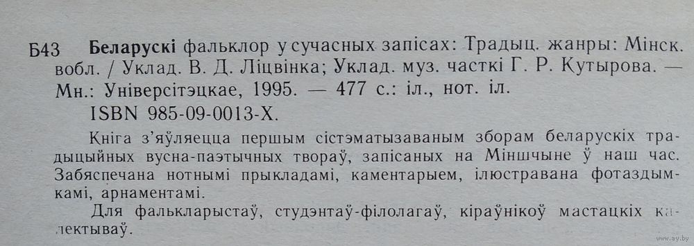 Беларускі фальклор у сучасных запісах: Традыцыйныя жанры: Мінская вобласць. Укладальнік В. Д. Ліцвінка. - Мінск. Універсітэцкае, 1995 г. 476 с. Цверды пераплет.