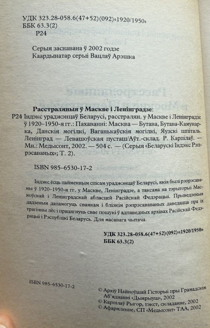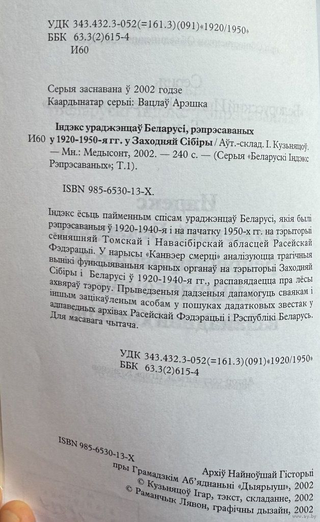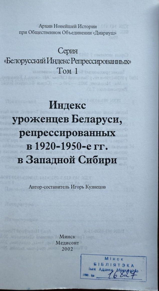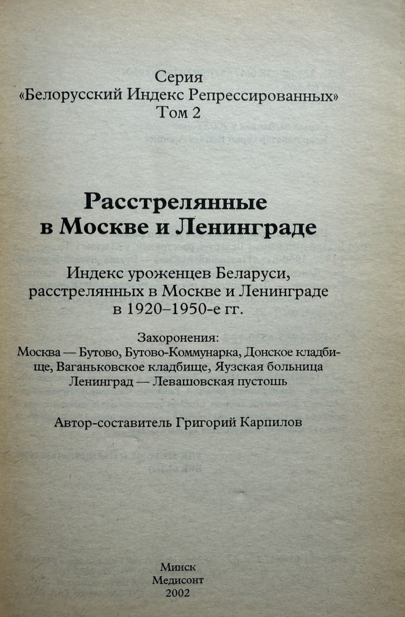 Беларускі індэкс рэпрэсаваных Два тамы Том 1 Індэкс ураджэнцаў Беларусі рэпрэсаваных у 1920-1950 у Заходняй Сібіры Том 2 Растраляныя ў Маскве і Ленінградзе у 1920-1950