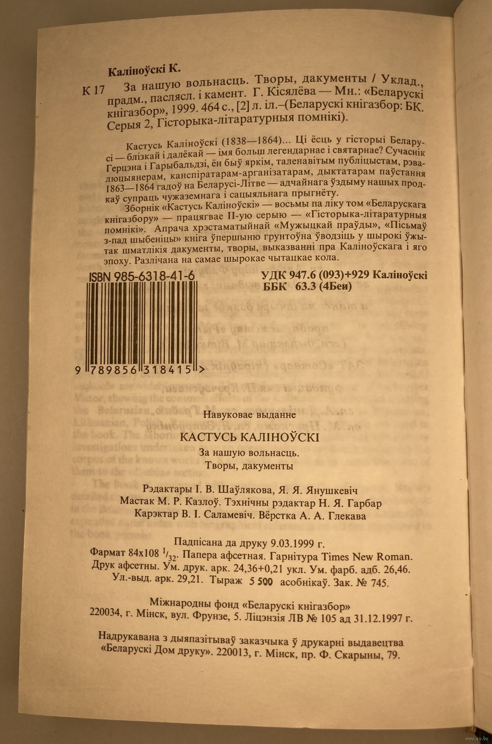 Каліноўскі, К. За нашую вольнасць : творы, дакументы / Кастусь Каліноўскі. — Мінск : Бел. кнігазбор, 1999. — 459, [5] с., [2] л. іл. — (Беларускі кнігазбор).
