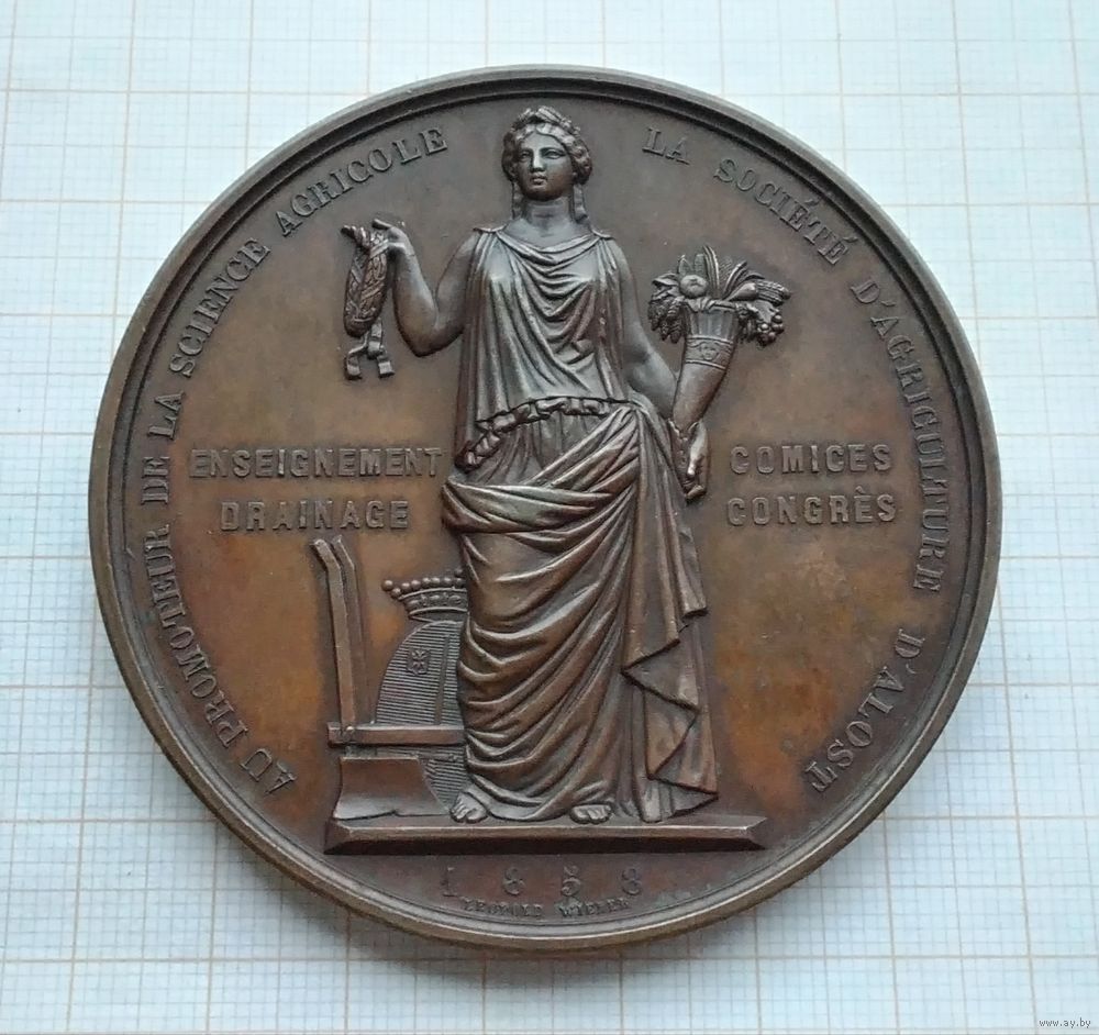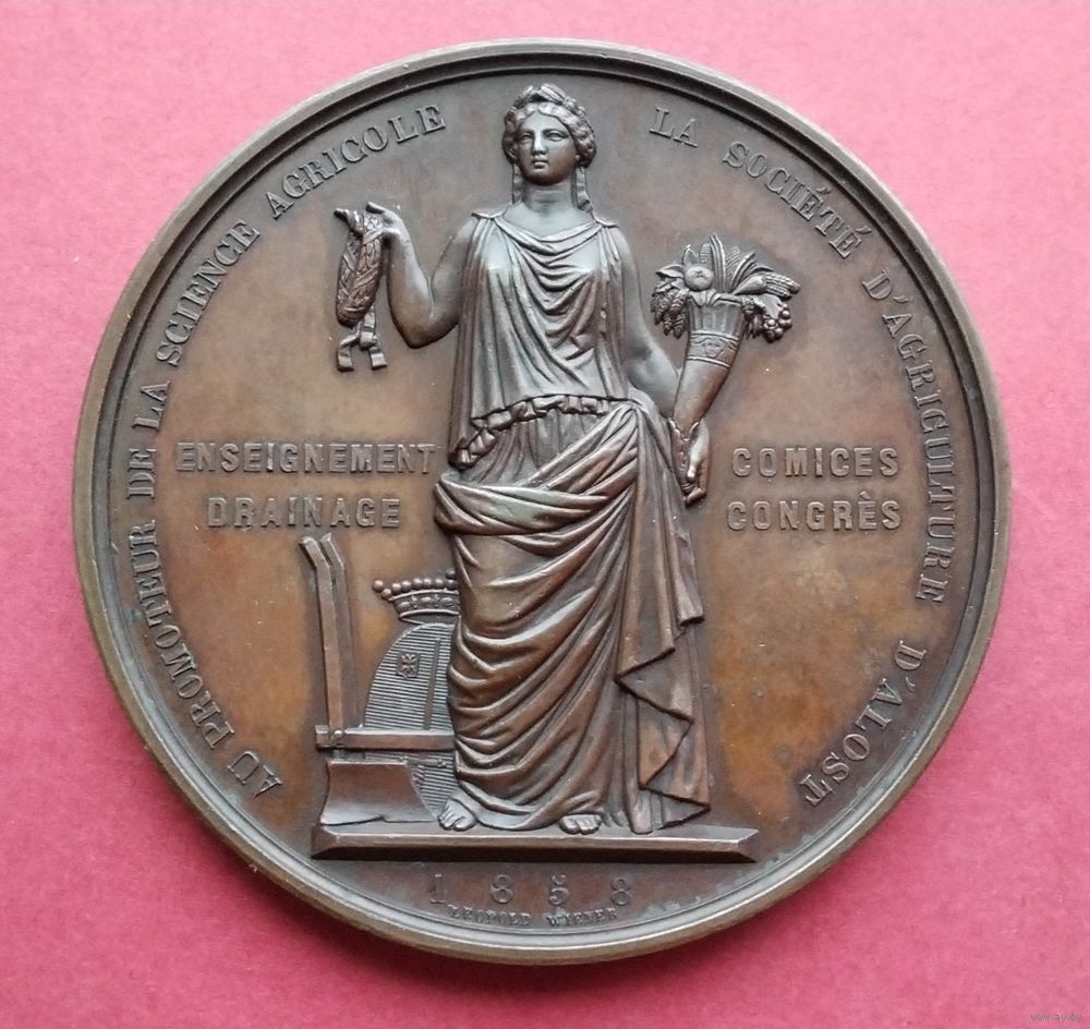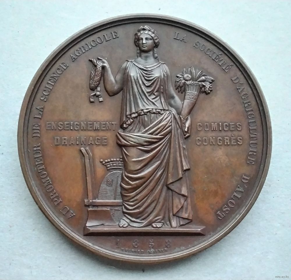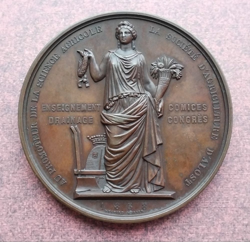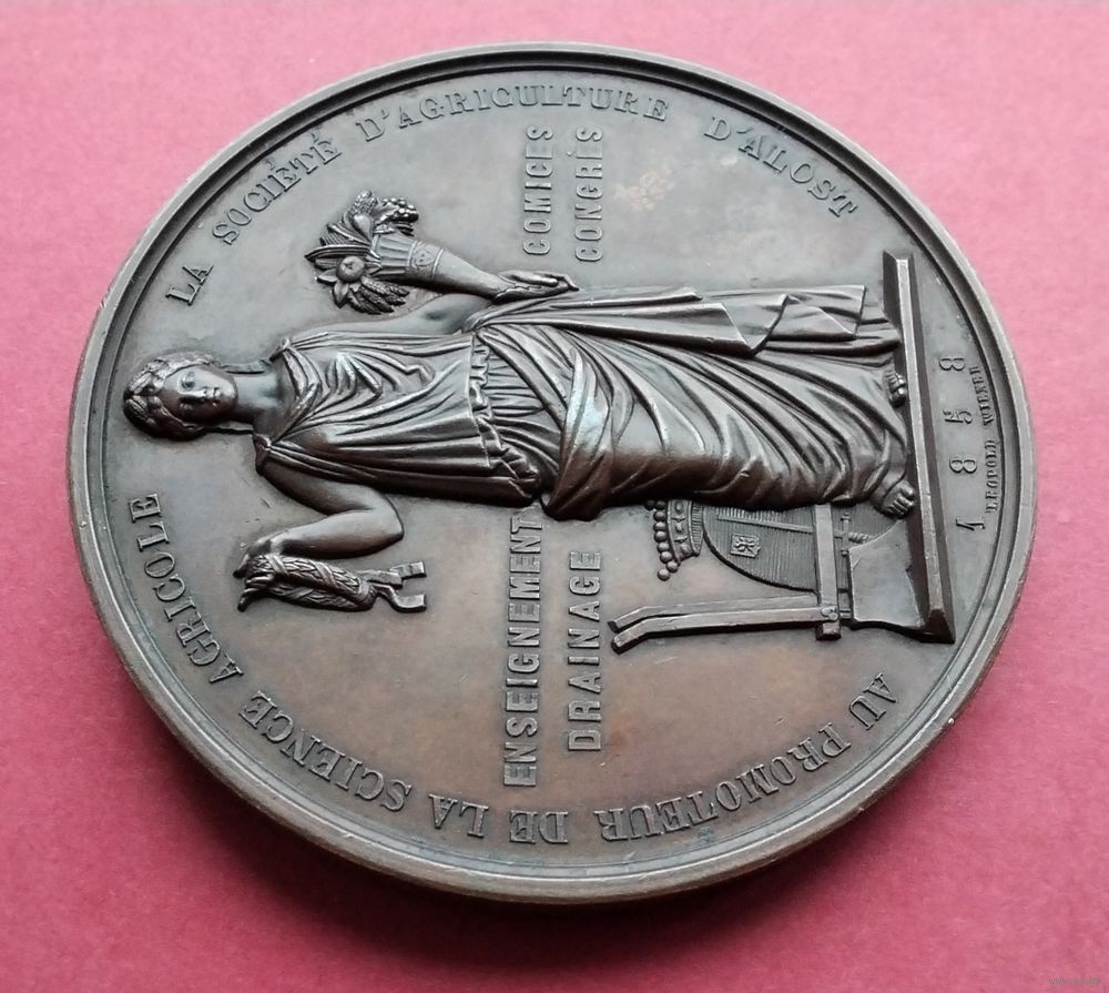 Бельгия 1858 г. За популяризацию сельскохозяйственной науки. Сельскохозяйственному обществу Алости. Медный сплав. Диаметр - 68 мм. Вес - 126 гр. Оригинал.