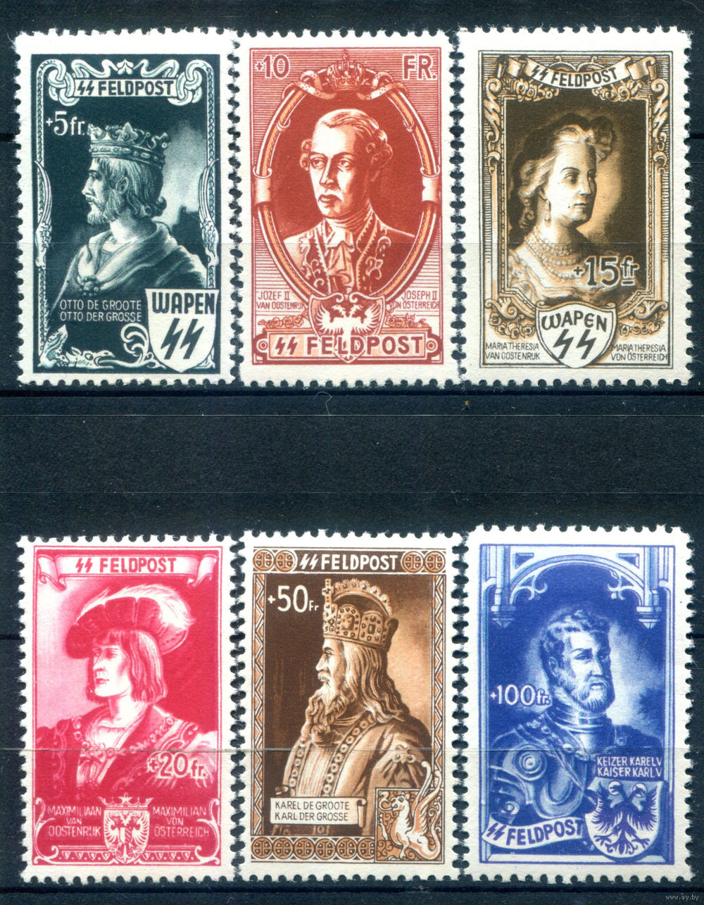 Бельгия - 1943г. - Фламандский легион, полевая почта, картины с императорами - 6 марок - полная серия, MH, MLH, у первой марки повреждён один зубчик перфорации слева сбоку [Mi IX-XIV]. #3-WK-90-A-1