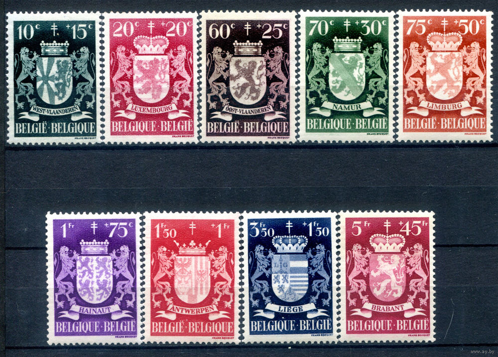 Бельгия - 1945г. - гербы, борьба с туберкулёзом - 9 марок - полная серия, MNH, 3 марки с повреждениями клея [Mi 721-729]. #3-WK-92-A-2