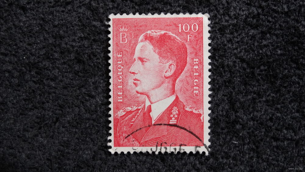 Изображение представляет собой бельгийскую почтовую марку номиналом 100 франков (F) с изображением короля Бельгии.