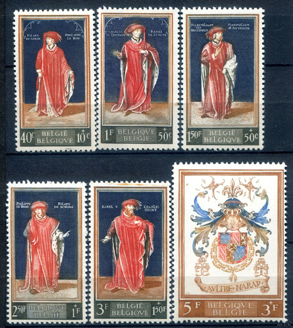 Бельгия - 1959г. - 400 лет королевской библиотеке, короли, картины, герб - 6 марок - полная серия, MNH, 1 марка с маленьким пятнышком на лицевой стороне (справа возле перфорации) [Mi 1155-1160]. #3-WK-100-A-2